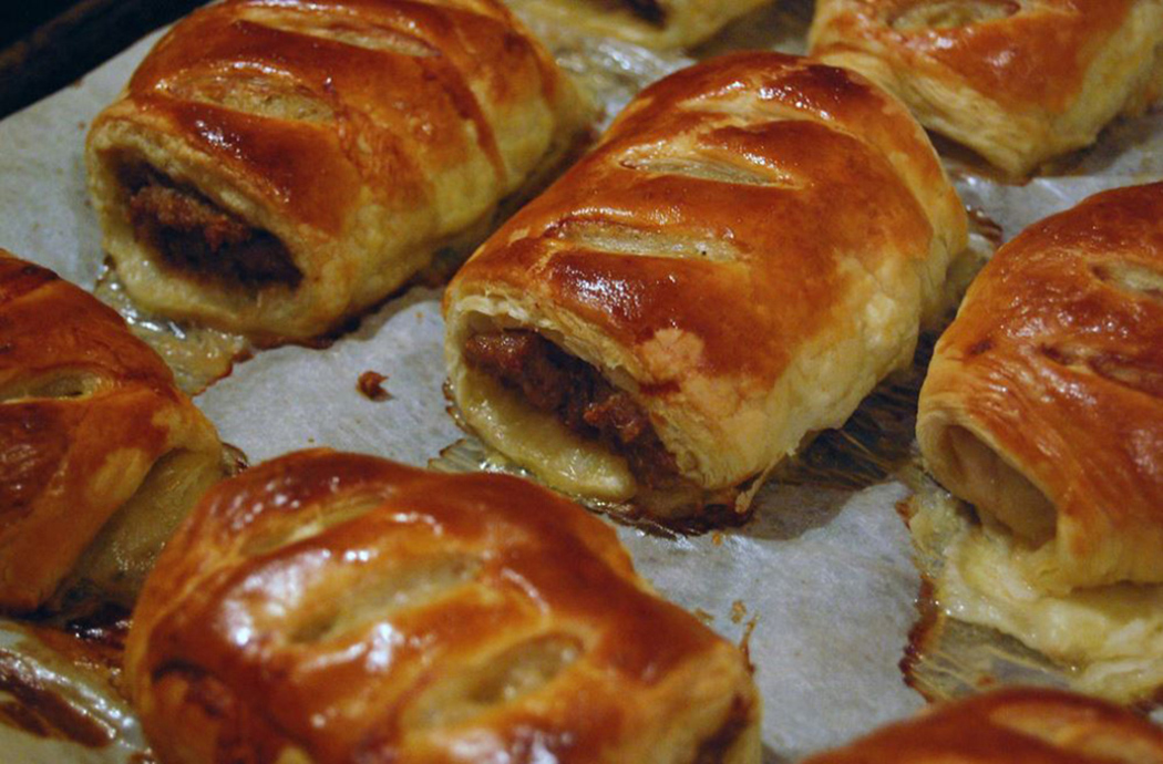Приготовление1. Очистить сосиски (колбасу) и приготовить пюре.2. Добавить нарезанный лук и листья шалфея и хорошо перемешать. 3. Использовать 1 или 2 листа теста, предварительно раскатав его. 4. Фарш уложить на тесто, свернуть рулетиком и защепить края теста смоченного яйцом или водой, а затем уложить на протвень швом вниз. Протвень застелить бумагой для выпечки. 5. Нарезать колбасные рулетики любого размера. 6. Сверху сделать один или два разреза ножом или ножницами и помазать яйцом. 7. Запекать при температуре 180 градусов в течении 10-15 минут, пока тесто хорошо не подрумянится. |