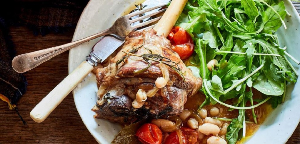 Баранья голень с белой фасолью и томатным соусом с розмарином
