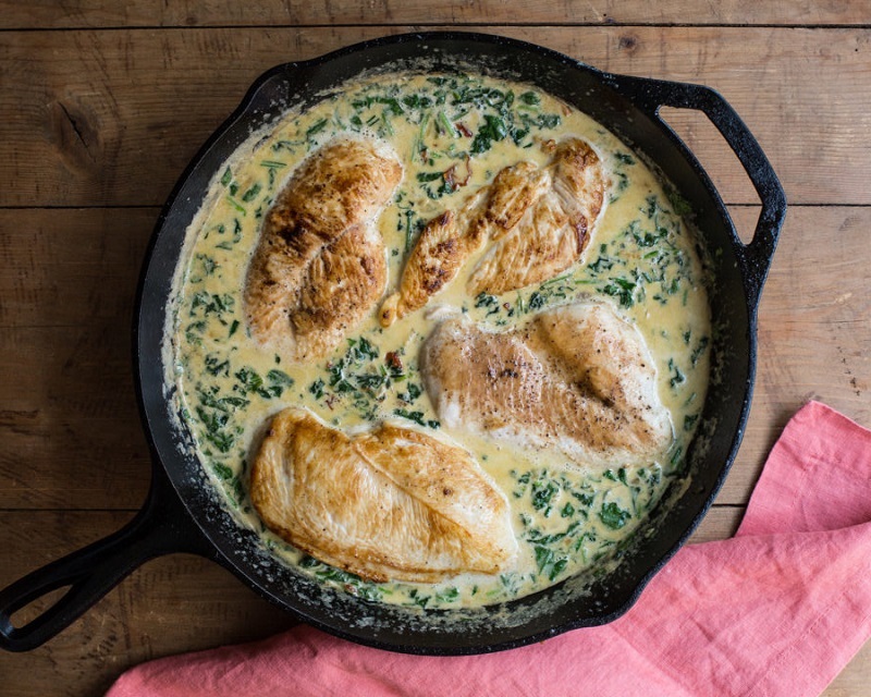 | Ингредиенты: 4 ломтика толстого разрезанного бекона 1 чашка нарезанного лука 250 гр. нарезанных грибов, любого вида соль и свежий молотый перец по вкусу 1 столовая ложка оливкового масла 700 гр. без костей без кожицы куриных бедрышек (около 6 штук) 4 чашки грубо нарезанного свежего шпината 1 стакан сливок 1/2 чашки куриного бульона 1 чашка измельченной моцарелла | Приготовление: 1. Нагрейте большую чугунную сковородку, на среднем огне и приготовьте бекон до хрустящей корочки, около 4 минут с каждой стороны. Переложите на тарелку, выровненную бумажными полотенцами и полейтье 2 чайными ложками сала. 2. Верните кастрюлю на среднюю температуру и обжарьте лук и грибы до золотистого цвета, около 7 минут. Приправьте солью и перцем и удалите их на блюдо. 3. Верните сковородку еще раз на среднюю температуру, добавьте оливковое масло и обжарьте куриные бедра в течение приблизительно 8 минут с каждой стороны, пока они не станут хорошо обжарены, но не совсем приготовлены. Выньте их на блюдо рядом с запеченными грибами и луком. 4. Возвращаем на огонь сковороду и добавляем шпинат. Обжарьте в течение 2 минут, пока шпинат не завянет, затем добавьте сливки и бульон и доведите до кипения. Приправьте солью и перцем, вмешайте сыр и продолжайте помешивать, пока сыр не расплавится. 5. Пока шпинат готовится, нарежьте приготовленный бекон. Размешайте бекон вместе с приготовленными грибами и луком в соусе. Засуньте куриные бедра в кипящий соус и продолжайте готовить на среднем огне до тех пор, пока курица не будет приготовлена, еще около 5 минут. Подавать с кастрюли. |