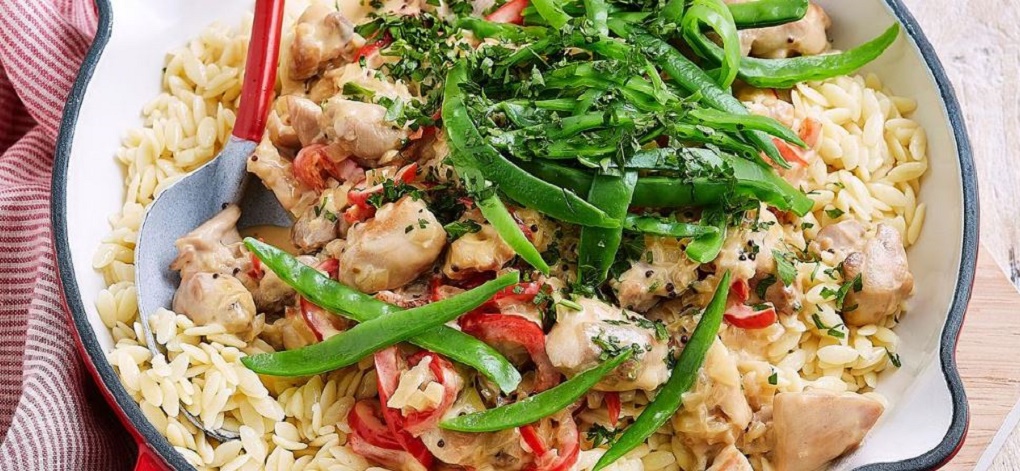 Ингредиенты:1 1/2 чашки Oрзo 2 столовые ложки оливкового масла 500 гр. куриное филе (бедра), нарезанные 1 красный стручковый перец, тонко нарезанный 1 луковица, мелко нарезанная 1 зубчик чеснока, дробленый 2 столовые ложки меда 1 столовая ложка цельнозерновой горчицы 3/4 чашки сливок 100 гр. горошка, очищенного 2 столовые ложки петрушки, нарезанной |
