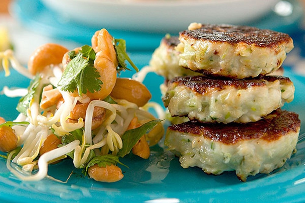 | Ингредиенты: 1 весенний лук ½ зеленый чили 1 шт. имбиря, 2 см, очищенного и мелко нарезанного 300 гр. рыбы, такая как гурнард или лимонная рыба 1 зубчик чеснока ¼ стакана листьев базилика и листьев кориандра 2 ч.л. рыбного соуса 1 ст. Мирин 2 столовые ложки растительного масла 2 ч.л. соевого соуса 1 ст.л. кокосового молоко 1½ чашки бобовых побегов 3 столовые ложки орехов кешью, жареные и соленые, грубо нарезанные 2 лимона ½ ч.л. кунжутного масла 2 щепотки свежего молотого черного переца | Приготовление: 1. В миску кухонного комбайна добавьте рыбу, лук, чили, имбирь, чеснок, мирин и рыбный соус. Взбивать до образования грубой пасты. 2. Добавьте свежие травы, кокосовое молоко и соевый соус, затем снова всё перемешайте. 3. В сковороду на тяжелой основе вылейте 1 ст. л. растительного масла. 4. Когда масло достаточно разогреется, выложите ложкой смесь рыбьего пирога и варите в течение 2 минут в жару с высокой температурой или до коричневого цвета, затем переворачивайте и продолжайте. 5. Готовьте партиями, добавляя дополнительное масло к каждой новой партии. Используйте бумажные полотенца. 6. Объедините ростки, кешью и кунжутное масло в миске. 7. Добавьте листья кориандра, затем выдавите сок одного лимона, добавьте молотый перец и соедините с пальцами. 8. Выложите пироги в стопку с небольшой кучей салата и клиньями из лимона. |