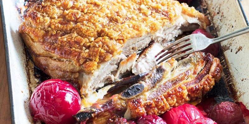 | Ингредиенты: 1 1/2 - 2 кг свиной грудинки 1 ст. л. морской соли оливковое масло 2 ст. л. цельнозерновой горчицы 1/2 чашки яблочного уксуса 1/2 чашки воды 6 - 8 средних слив, разрезанных пополам,без косточки салат, для подачи | Приготовление: 1. Разогрейте духовку до 250 ° C. 2. Убедитесь, что свиная лопатка сухая,промокнув мясо кухонным полотенцем. Натрите со всех сторон солью, а форму, в которой будет печься мясо, сбрызните маслом. 3. Поместите блюдо в духовку и готовьте 45 мин. 4. Смешайте горчицу, уксус и воду, затем налейте вокруг свинины. 5. Мясо прикройте фольгой (чтобы предотвратить горение). 6. Понизьте температуру к 180°C и приготовьте в течение 1 часа. 7. Добавьте сливы вокруг свинины и продолжайте запекать ещё 20 мин., пока сливы не будут приготовлены. 8. Отставить на 10 мин. 9. Подайте свинину в массивных, сочных частях со сливами и салатом. |