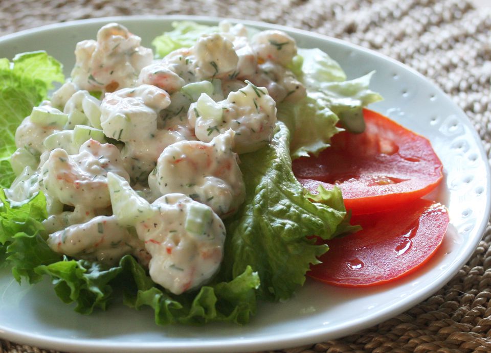 | Ингредиенты: 900 гр. малой и средней креветки отварной, охлажденной 2 шт. сельдерея, нарезанного кубиками 1 маленький огурец, удаленные семена, нарезанный кубиками 2 столовые ложки свежего укропа 1 столовая ложка лимонного сока 4 столовые ложки майонеза 2 столовые ложки сметаны или по вкусу Соль и перец для вкуса | Приготовление: 1. В миске смешайте креветки, нарезанный кубиками сельдерей, нарезанный кубиками огурец, соус укропа, лимонный сок, майонез и сметану. 2. Добавьте соль и перец по вкусу. 3. Легко всё перемешайте, чтобы полностью соединить ингредиенты. Охладите до употребления. 4. Этот салат из креветок отлично подают как на салате или подают его как сэндвич-начинку в мягких рулонах или булочках. |