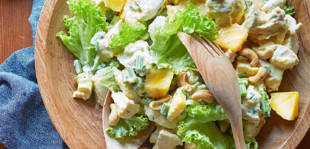 Ингредиенты:4 куриные грудки, без кожы 1/2 чашка белого вина 1 лавровый лист 2 или 3 перца 4 палочки сельдерея, нарезанные кубиками 4 весенних луковицы, тонко нарезанные 1 спелый манго, очищенный и нарезанный кубиками 1 ст. л. свежей петрушки, мелко нарезанной листья салата 1/2 чашки жареных орехов кешью Соус: 1/3 чашки сливок 1/2 чашки сметаны | Приготовление:1. Поместите грудки в горшочек. Добавьте вино, лавровый лист, перцы и воды (чтобы мясо было полностью покрыто).Отставьте в сторону минут на 20 ( если располагаете временем, можно и на дольше). 2. Выньте мясо из маринада. Смешайте кусочки курицы с сельдереем, зеленым луком, манго и петрушкой. Отставьте. 3. Для соуса: смешайте все ингредиенты, приправьте по вкусу. 4. Когда вы будете готовы подавать блюдо, вылейте соус на салат и осторожно подкиньте. 5. Возьмите сервировочную миску или блюдо, выложите листья салата, на верх приготовленное мясо и посыпьте орехами кешью. |