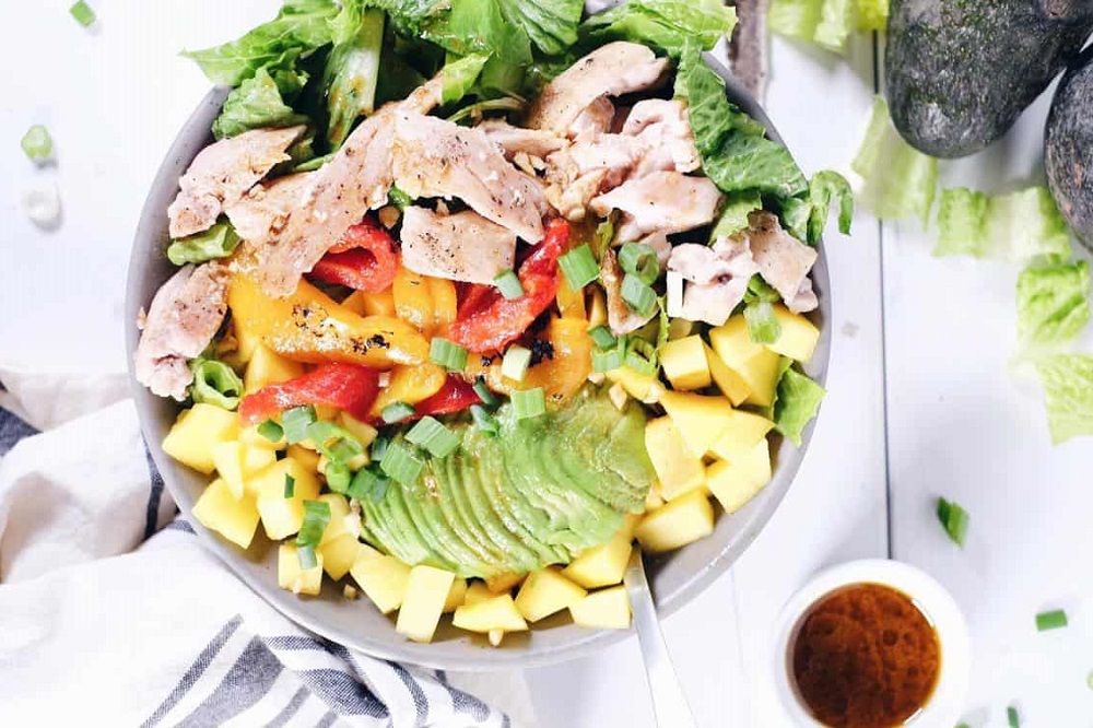 Ингредиенты:Для соуса: 1/4 стакана оливкового масла 1/2 стакана свежевыжатого сока лайма 4 зубчика чеснока, рубленого 2 ч.л. меда 1 ч.л. порошка чили 1 ч. л. тмина 1 ч. л. морской соли Для салата: 1 ст. л. масла авокадо 1,5 кг куриных бедер без кожи 8 чашек салата ромэн, нарезанного 1 большое манго, нарезанное кубиками 2 авокадо, нарезанные кубиками 4 зеленых пера лука, нарезанных кубиками 1 банка жареных болгарских перцев, подсушеных | Приготовление:1. Подготовьте соус, смешав все ингредиенты для заправки в миске и взбивая, чтобы все смешать. 2. Нагрейте большую сковороду на среднем огне и добавьте масло авокадо. Приправить курицу солью и перцем с обеих сторон. Как только сковорода станет горячей, добавьте курицу и готовьте с каждой стороны около 4-5 минут до золотисто-коричневого цвета и доведите до готовности. Выключите огонь и вылейте около 1/4 соуса в сковородку. Переверните курицу пару раз, чтобы она покрылась заправкой. Отложите курицу, пока вы будете готовить салат. 3. Нарежьте салат, манго, авокадо и зеленый лук. Поместите все, кроме авокадо, в большую миску. Перемешайте салат. Влейте оставшуюся заправку и снова перемешайте. 4. Курицу нарежте мелкими полосками. Подавайте салат с курицей, авокадо и жареным перцем. |