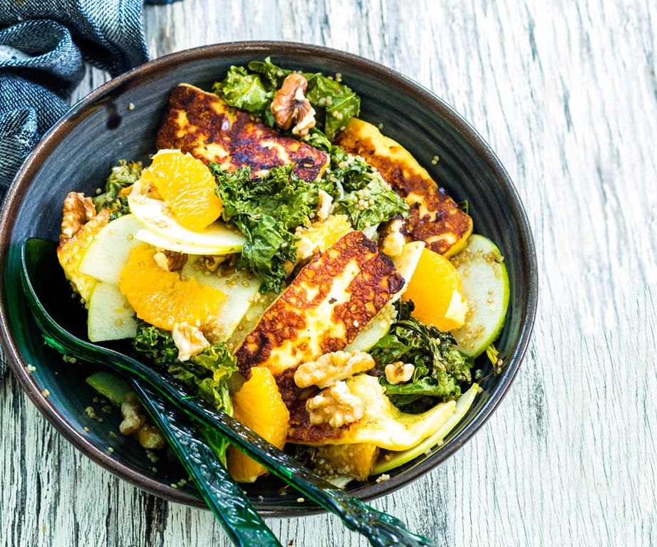 Салат с жаренным халуми, капустой, апельсином и яблоком