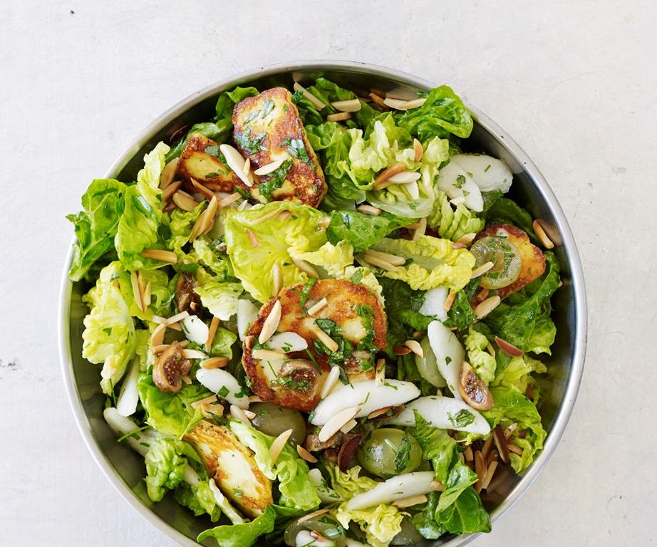 Салат с жаренным халуми, зеленным виноградом и салатом