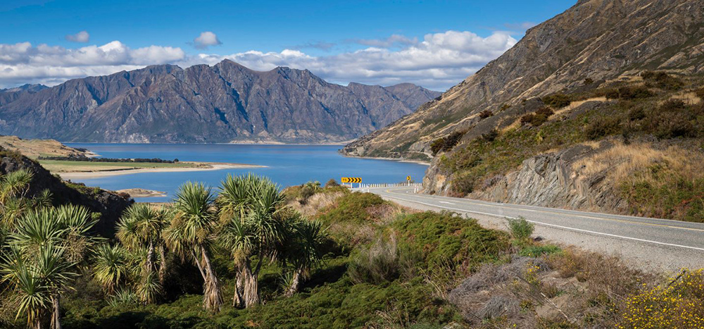 На севере трасса №6 проходит между этими двумя большими и красивыми озерами. С начало она бежит по восточному берегу озера Уанака, а потом, через пятнадцать километров, поворачивает на юго-восток и извилисто поднимаясь в гору, через несколько минут выходит на перевал Нек. Отсюда видно два озера и стоит указатель. Lake Wanaka 277 m-Lake Hawea 346 m. В этом месте озеро Хоея образует шести километровый рукав-самое короткое расстояние между двумя озерами. А дальше, за перевалом, плавный спуск и дорога уже проходит вдоль синих волн озера Хоея. Но так как климат в районе озера Хоея более сухой, а количество осадков не большое, то горы, которые со всех сторон окружают озеро, не покрыты таким пышным, зеленым покрывалом леса как, например, горы Западного побережья. Они здесь каменистые, покрытые травой. Только изредка встречаются одинокие пальмы и не большие, зеленые пятна лесов. Но когда на горизонте появляются домики городка Лейк Хоея, дорога оживляется высокими елями парка Лейк Хоея Холидей и панорама становится более привлекательной. Но главное то, что общая панорама вокруг озера какая-то загадочная, как будто машина времени перенесла тебя вдруг куда-то далеко-далеко в прошлое. Затерянный кусочек первобытности в дебрях цивилизованного мира. Могучие, серо-зеленые горы, со снежными языками на богатырских спинах своих, зеленые, горные луга, синяя гладь озерного простора и голубизна альпийского неба, с пятнами-химерами облаков на нем.